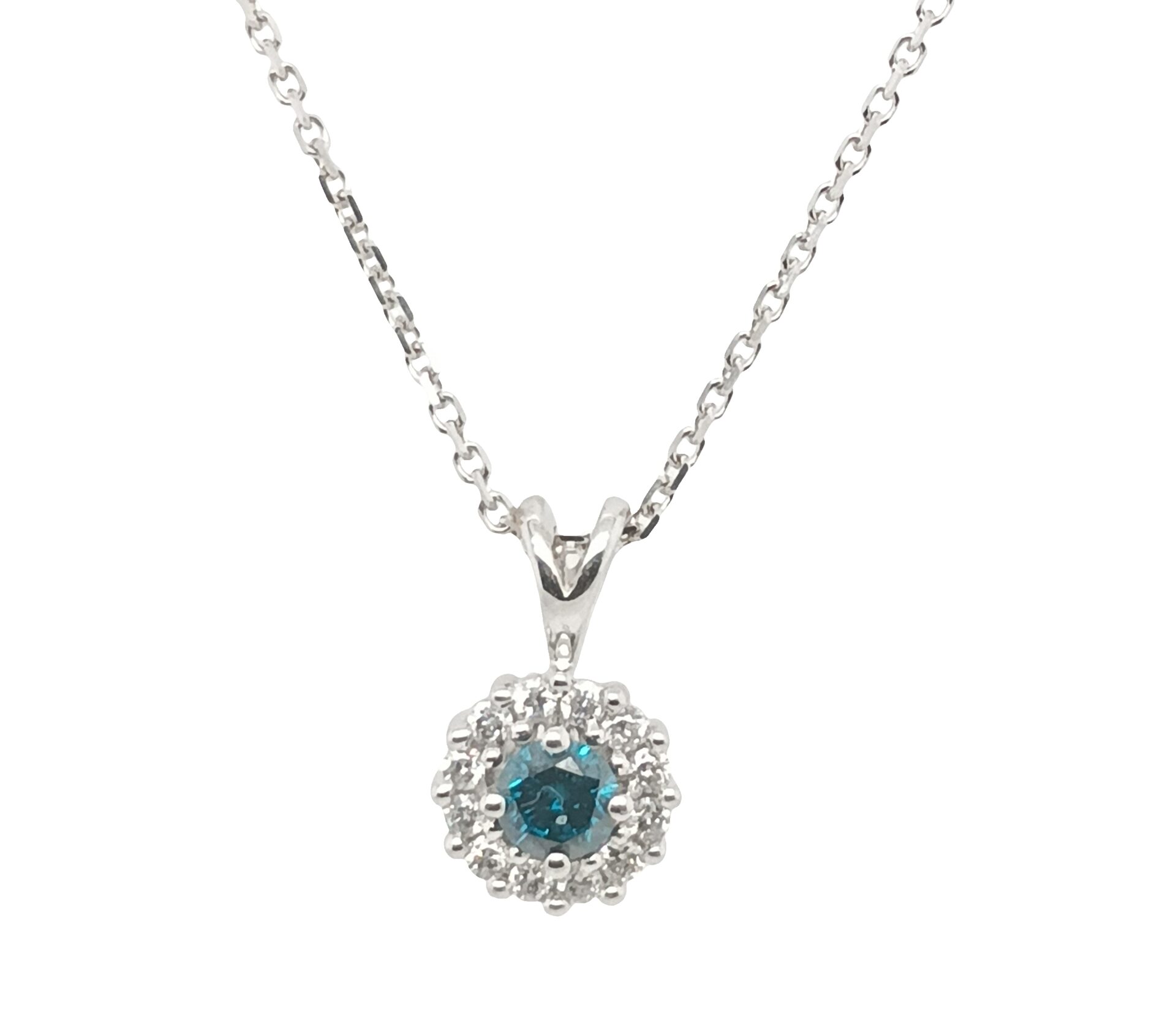 10 Karat White Gold Halo Pendant With 12 Natural Round Diamonds And One Round Blue Diamond together weighing approximately .33 CTW suspended from a 10K White Gold 16 inch, 1.1 mm Diamond Cut Cable Chain with Lobster Clasp