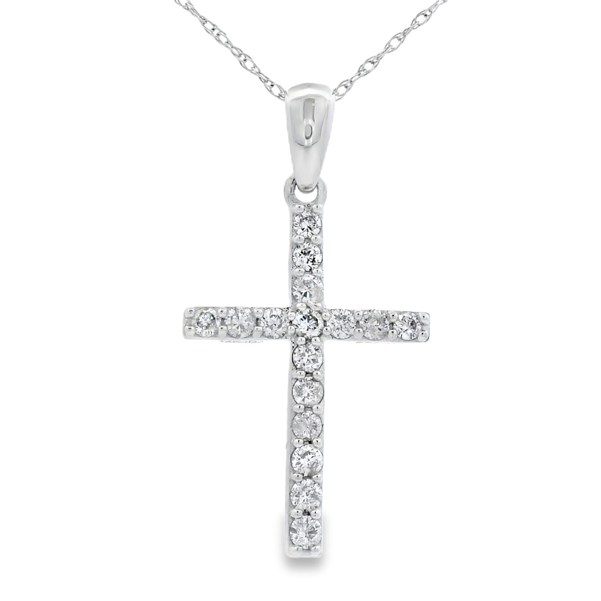 14KW Diamond Cross Necklace with 16 round natural diamonds, approximately 0.30 CTW, Color Estimate: H-I; Clarity Estimate: I1-I3 on 18 inch 14KW chain, spring ring clasp, 1.6gm/1.03 dwt