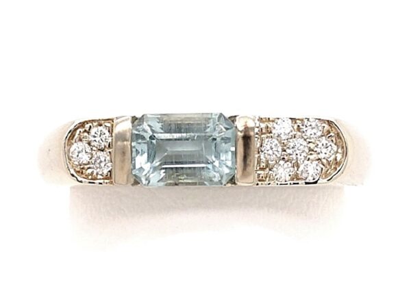 14 Karat White Gold Topaz And Diamond Ring With One 0.55Ct Emerald Cut Blue Topaz And Ten 0.10ctw Round Diamonds, Size 6.75