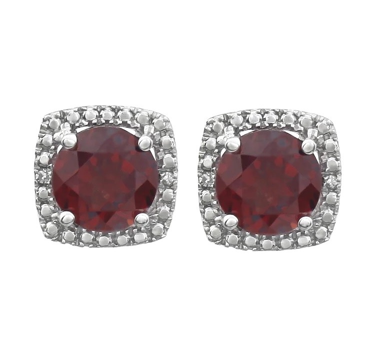 Sterling Silver Halo Earrings With Natural 6mm Mozambique Garnets And Round Diamonds .015 CTW, Rhodium-Plated, January Birthstone