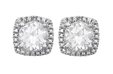 Sterling Silver Halo earrings each with one 6mm Lab Created round White Sapphire and .015 CTW round diamonds Rhodium-Plated April Birthstone