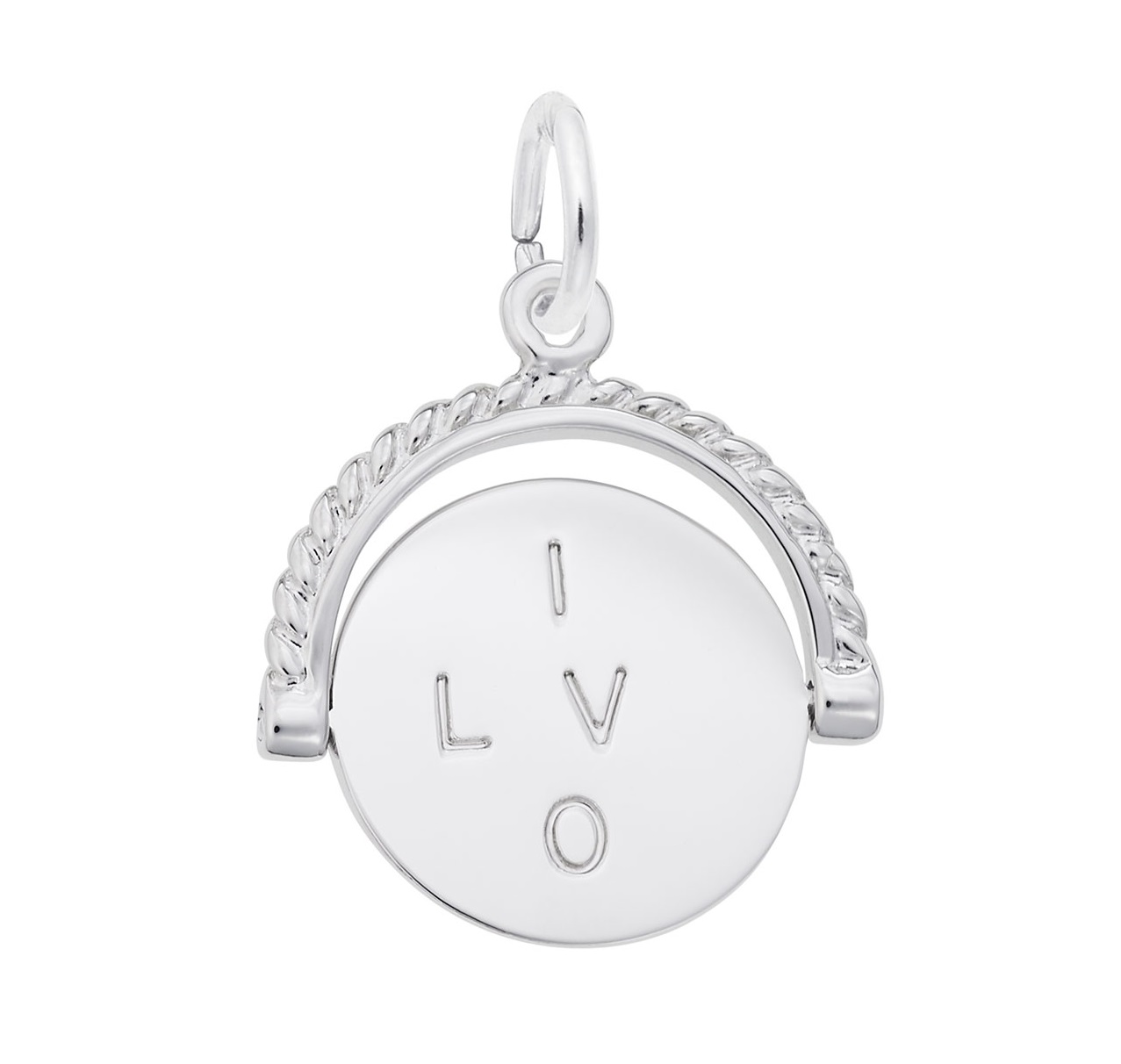 Sterling Silver Rhodium Plated I Love You Spinner Charm The Reverse Side Of The Disk Has The Remaining Letters O, E, Y, & U, 0.7 In X 0.62 In