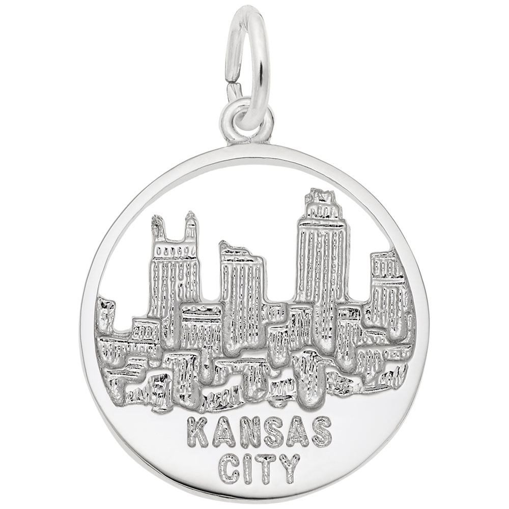 Sterling Silver, Rhodium Plated Kansas City Skyline Open Disc Charm, 0.76 in x 0.76 in, Inscribed “KANSAS CITY”, stunning tribute to the city’s vibrant spirit