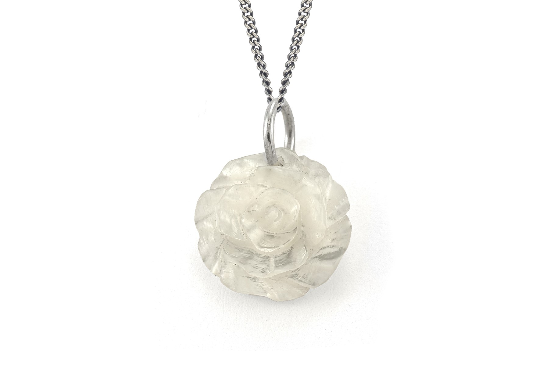 Sterling Silver, Mother of Pearl Hand Carved Rose Pendant on 16 inch cable link chain, lobster clasp