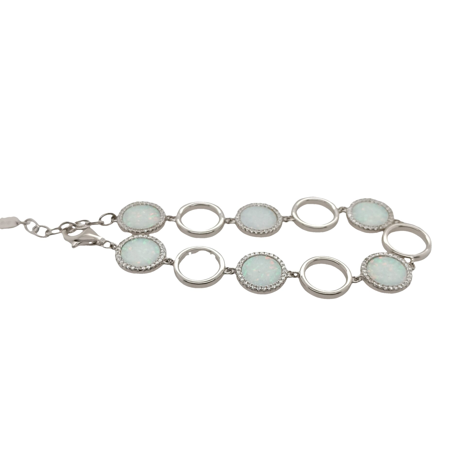 Sterling Silver Open Circle alternating with Lab Opal and CZ circular halo links. Length is adjustable from 6.5 to 7.5 inches with lobster claw clasp