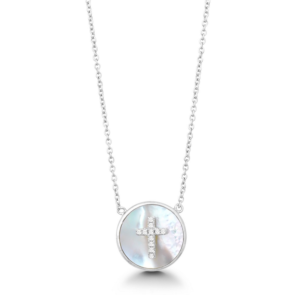 Sterling Silver, Round Mother of Pearl with Center CZ Cross Necklace
