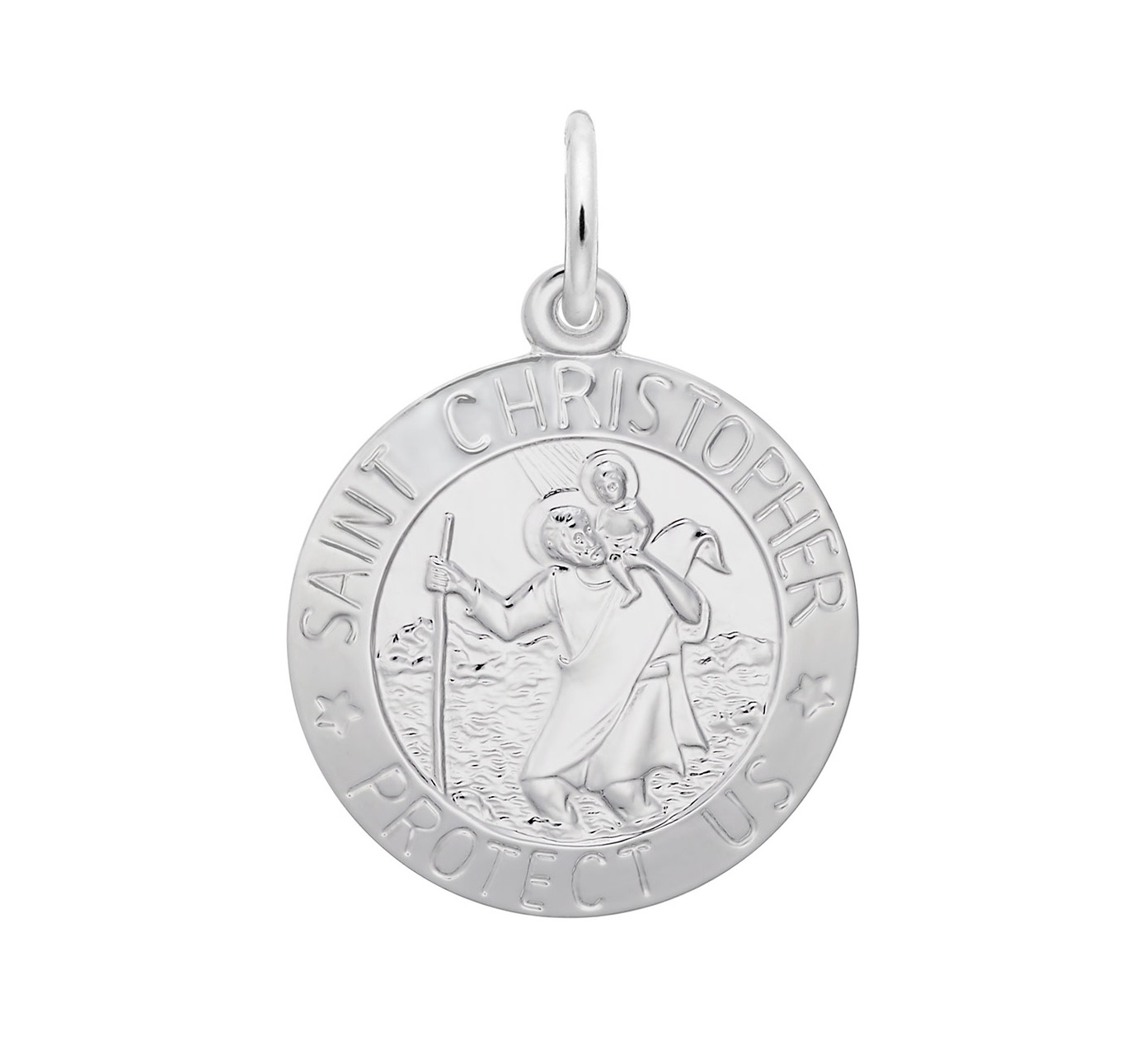 Sterling Silver Rhodium Plated St. Christopher Disc Charm, Inscribed With ‘St. Christopher Protect Us’, 0.78″ X 0.78″, Engravable On Back