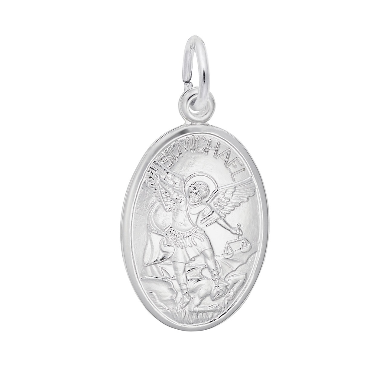 Sterling Silver Rhodium Plated St. Michael Oval Disc Charm, 0.55″ x 0.76″, Engravable On Back