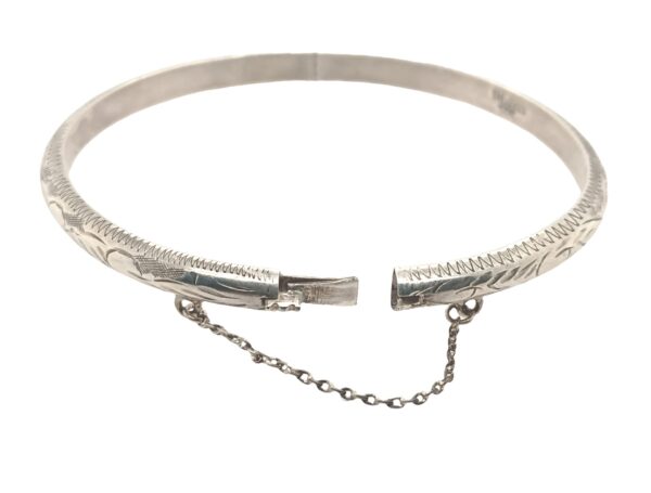 Sterling Silver Vintage Etched Design Hinged Bangle with hidden box clasp and safety chain. Internal diameter is approximately 60mm, width is approximately 5mm, should fit average wrist, 4.94 dwt/7.67gm