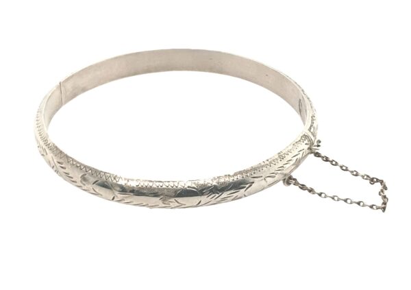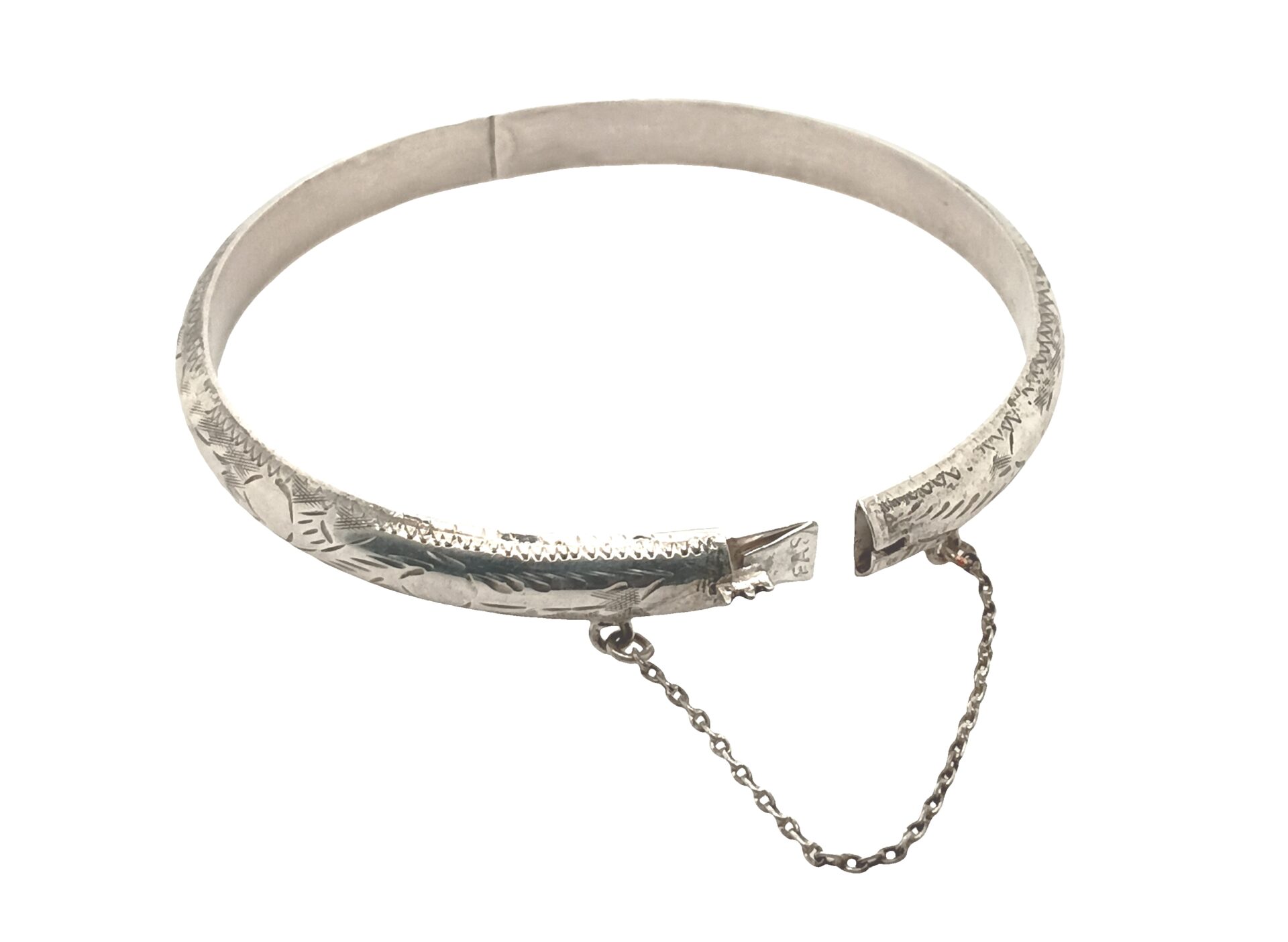 Sterling Silver Vintage Etched Design Hinged Bangle with hidden box clasp and safety chain. Internal diameter is approximately 59mm, width is approximately 7mm, should fit average wrist, 5.70 dwt/8.86gm