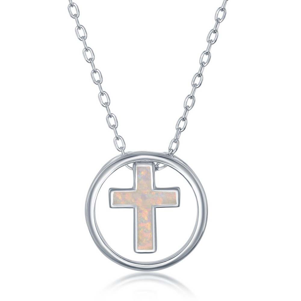Sterling Silver White Inlay Opal Cross Necklace With Sterling Silver Cable Chain 18″ (16″ + 2″ Extender)
