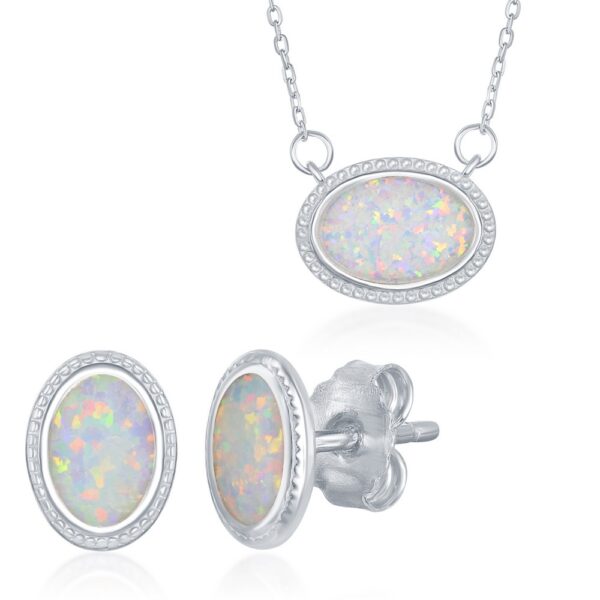 Sterling Silver, White Inlay Opal Studded Border Oval Necklace & Stud Earrings Set