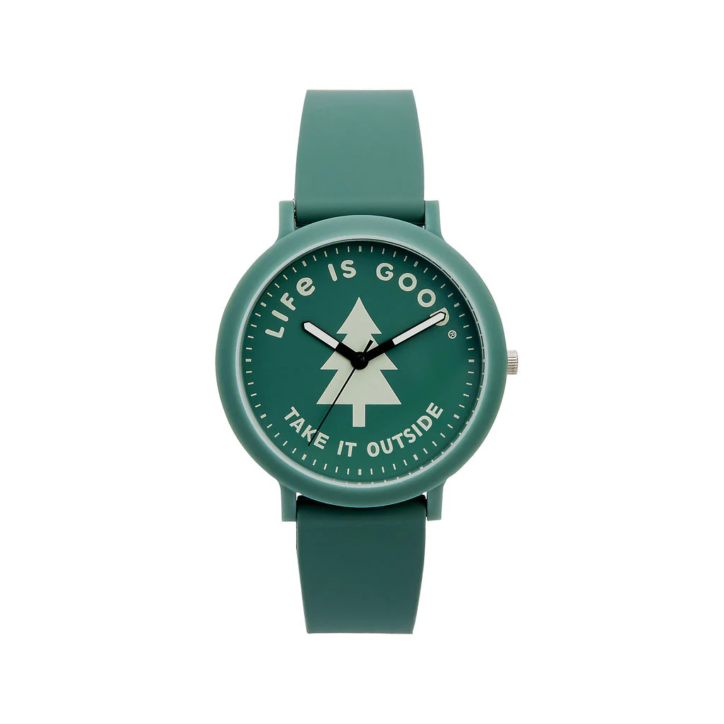 The Life is Good® by Speidel Watch (40mm) case with stainless steel case back, Japan Quartz movement and soft-touch silicone strap. The Take it Outside style features a granite green dial and band.