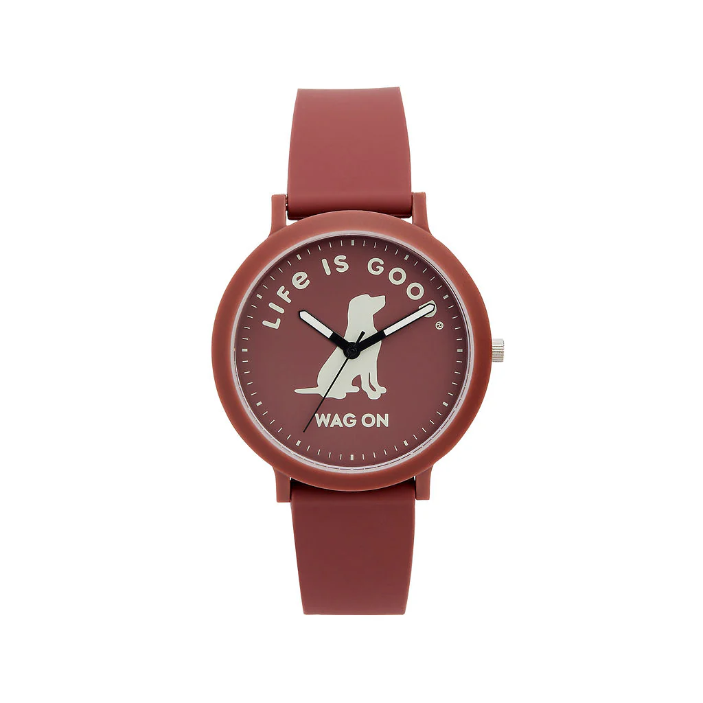 The Life is Good® by Speidel Watch (40mm) case with stainless steel case back, Japan Quartz movement and soft-touch silicone strap. The Wag On sytle features a mahogony brown dial and band.